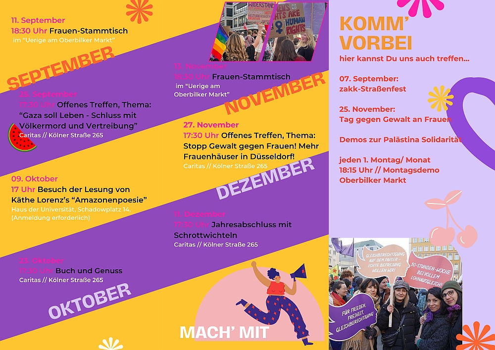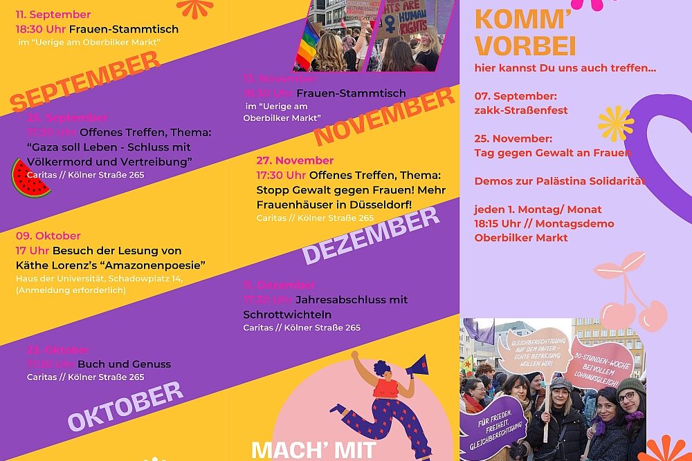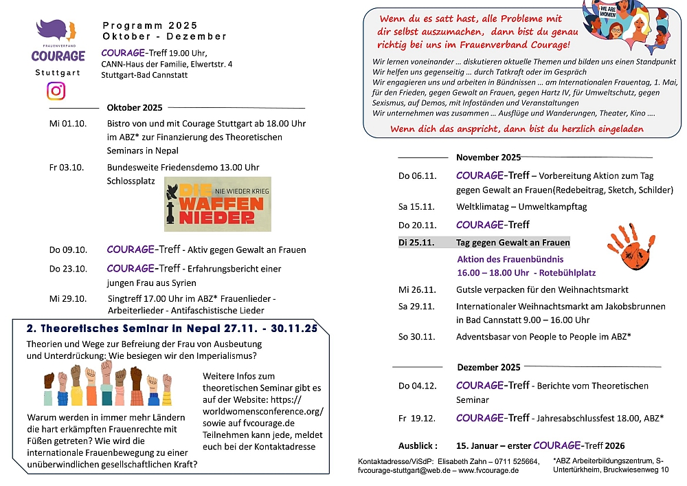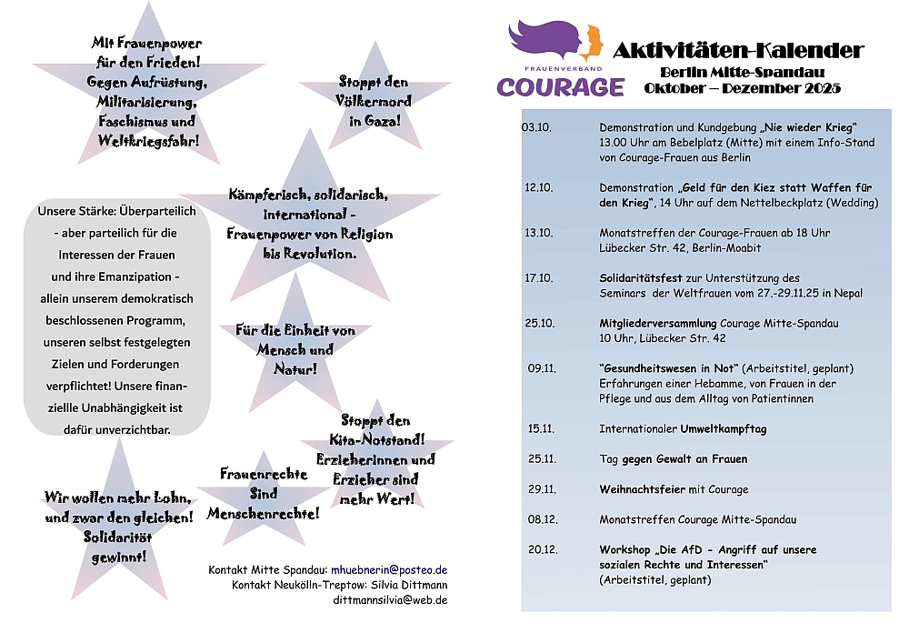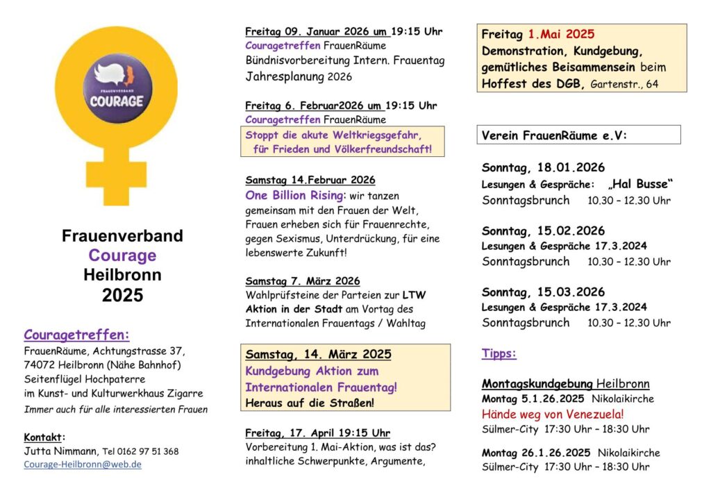 - Beim Treffen im Dezember am 21.12. wollen wir in vorweihnachtlicher Stimmung auf das Jahr 2025 zurückblicken. Interessierte Frauen und Bündnispartnerinnen sind herzlich eingeladen.