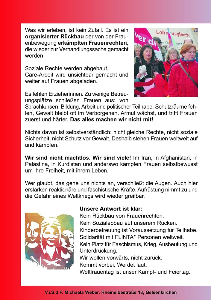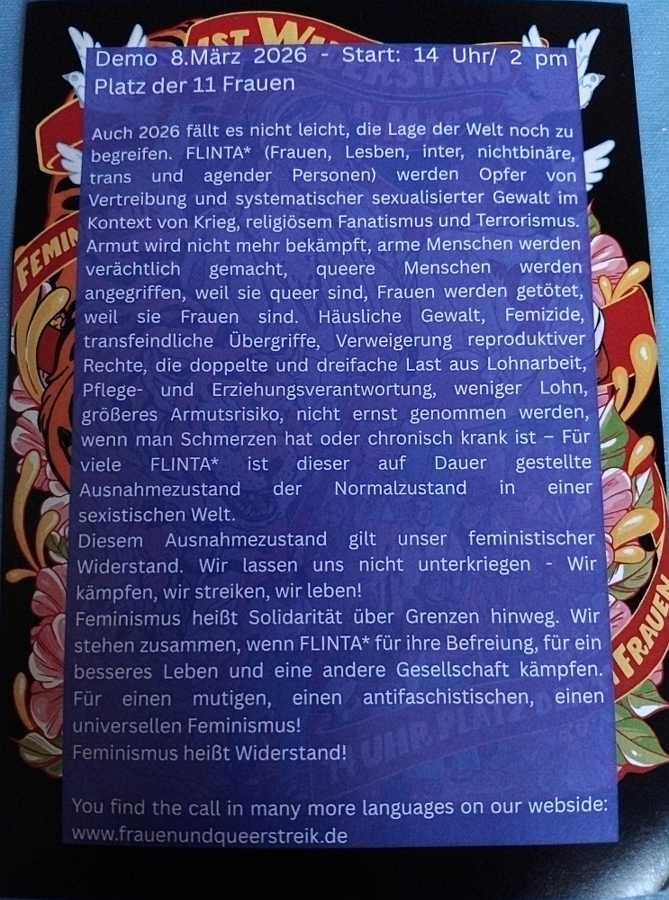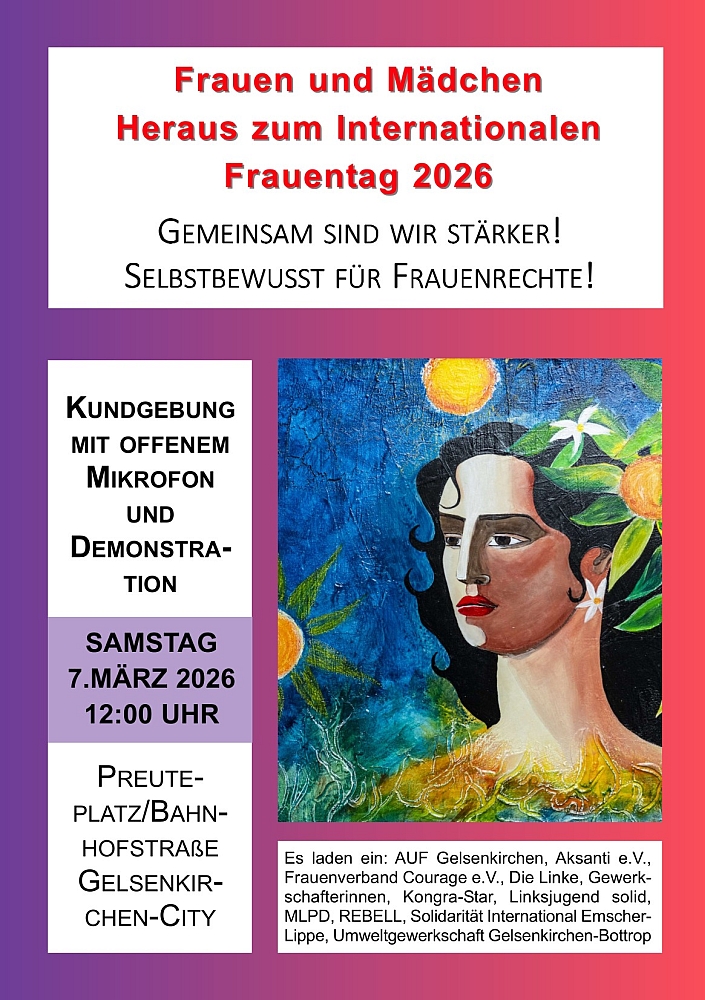 08.03.26 14:30 Uhr (Start der Kundgebung, 15:30 Uhr Start der Demo)