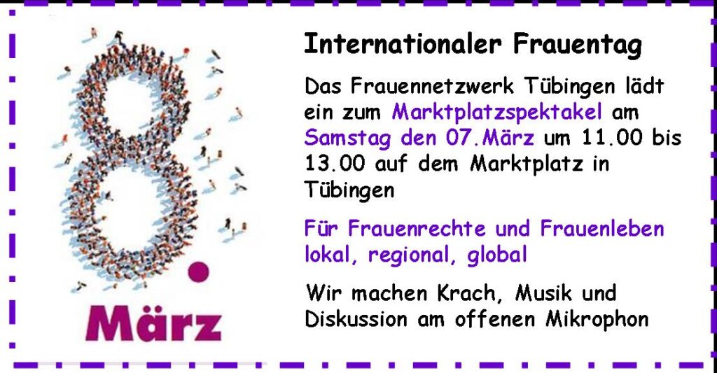 Alle Frauen und Mädchen sowie ‚frauenbewegte‘ Männer sind herzlich eingeladen, dabei zu sein, gerne auch mit einem eigenen Infotisch – alles auf antifaschisttischer Grundlage!