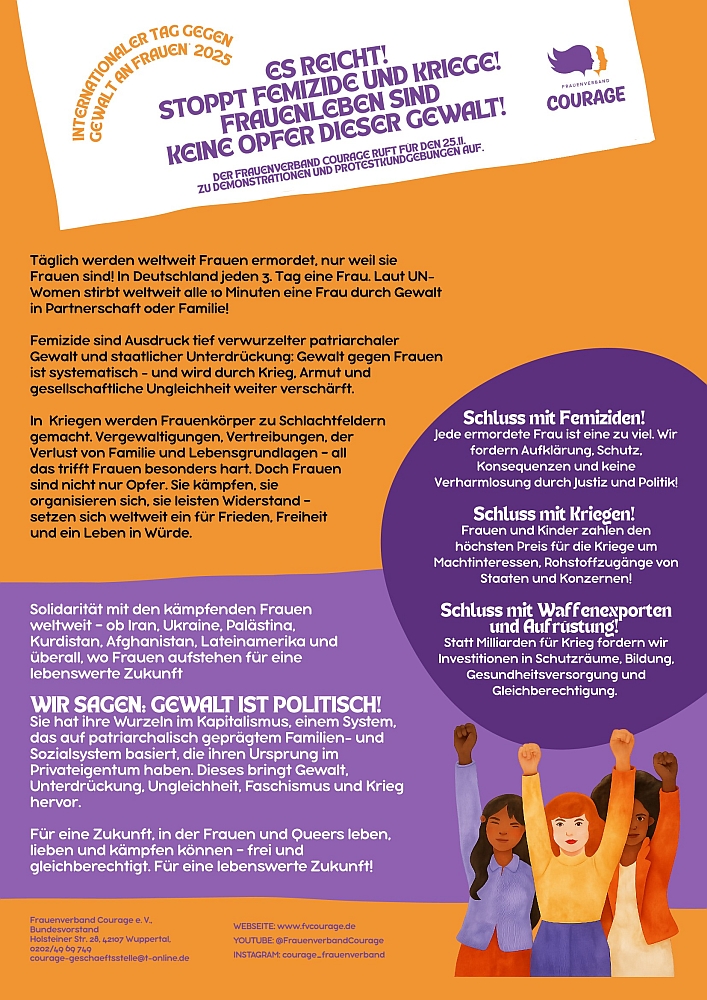 Mit dem folgenden Flyer ruft der Bundesvorstand des Frauenverbands Courage zum Internationalen Tag gegen Gewalt an Frauen am 25.11.25 auf.