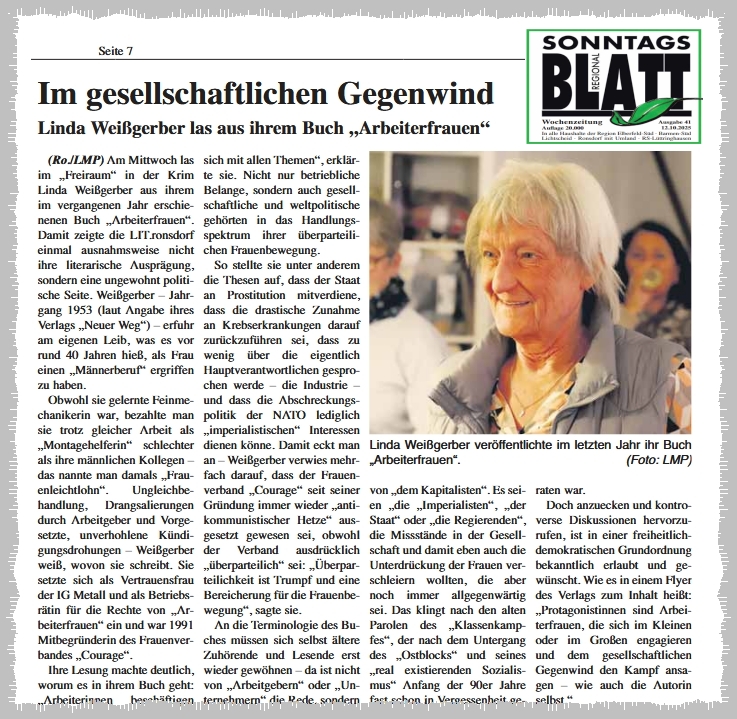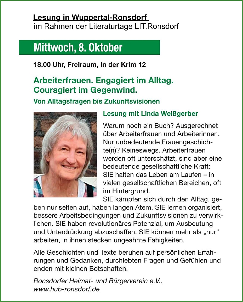 Auf Einladung der Wuppertaler Literaturwochen LIT.Ronsdorf machte ich am 8.Oktober eine Lesung meines Buches „Arbeiterfrauen“. Über 20 Besucherinnen aus dem Stadtteil und ein Pressefotograf hörten interessiert zu.